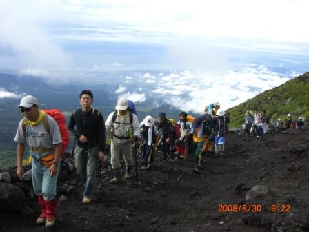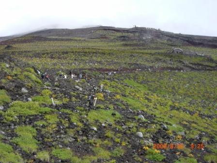 上に見えるのが富士宮から見た8合目山小屋。かなり急な岩場でしょう?