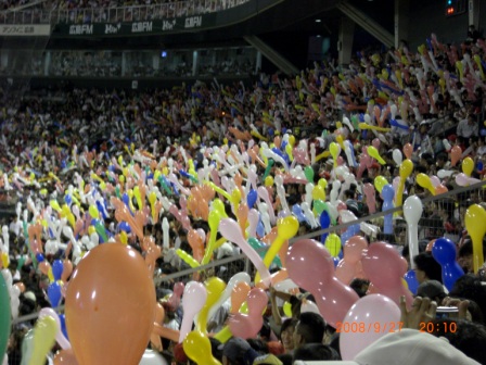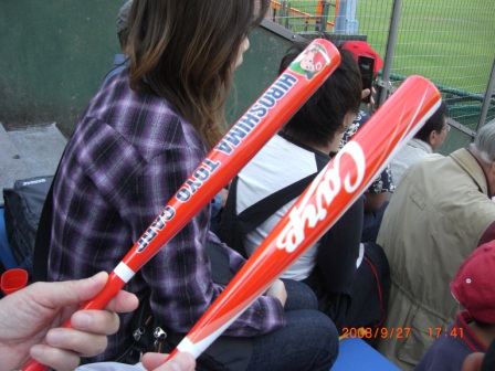 応援グッズのバットも購入し、ジェット風船は後ろの席にお客さんに余りをもらって(いいなあ、この感じ)。でも、せっかく7回の応援タイムのときに、パウチ君がSOS!風船が飛ぶのを見ることができず、トイレに駆け込んでしまいました。(泣)幸い、事件は起きませんでしたが(笑)