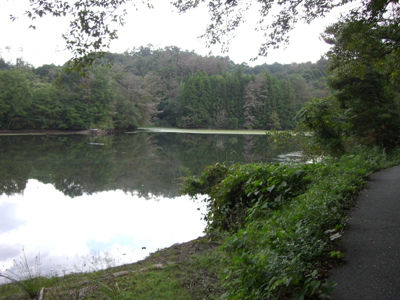 で、やっとついたのが山頂に近いところにある貯水池(堤)。この水は下の地域の田んぼに引かれています。だから山を歩いていると水の音がするし、蛙の声もする。カジカのような感じもするけど、そんなきれいな水じゃないと思うし、何という蛙かな?