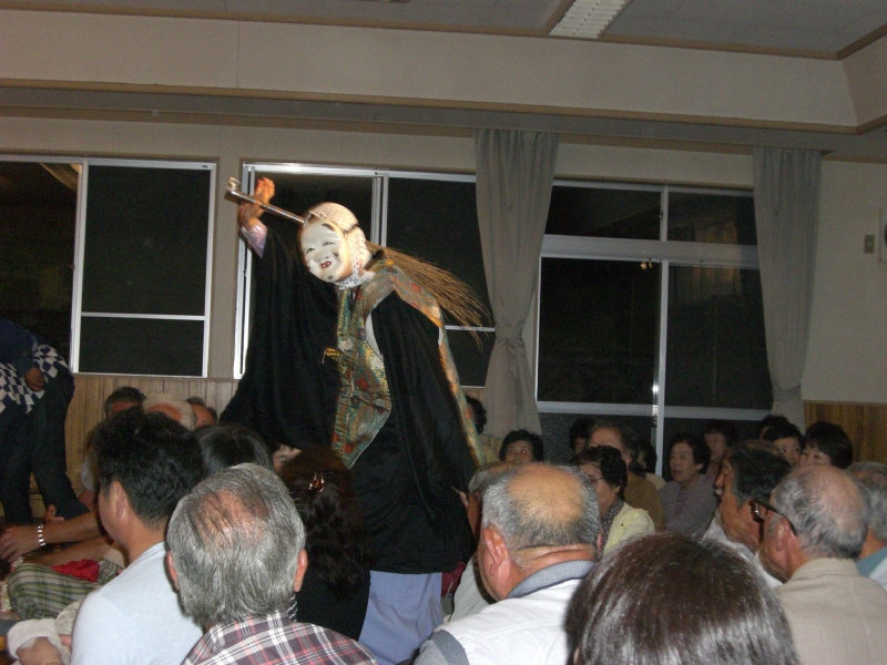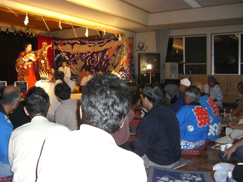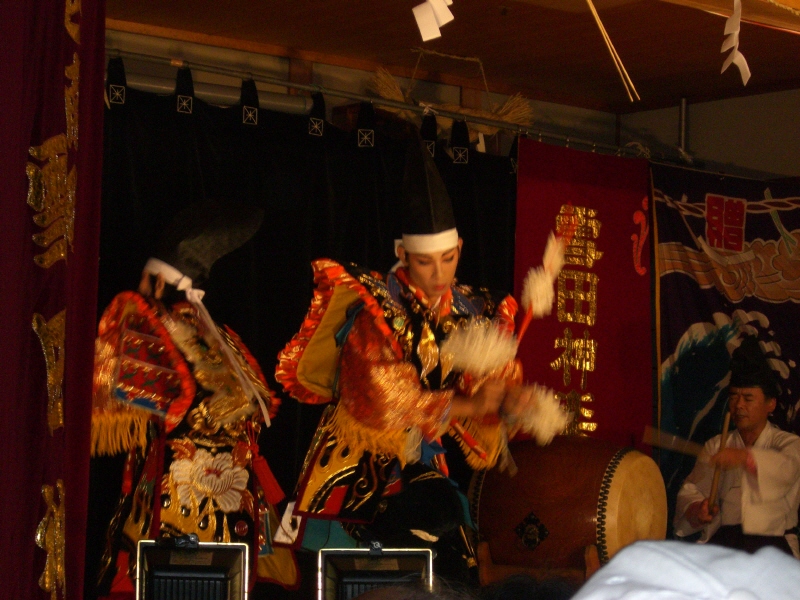 今回の神楽は集会所の建物の中でやってましたが、立ち見が出るほどの盛況!なんか、いままでの秋祭りで見てきた神楽と雰囲気が違うぞと思いながら、人ごみを掻き分けながら空いた席を確保!第一幕は終っていましたが、第二幕から座ってみることができました。