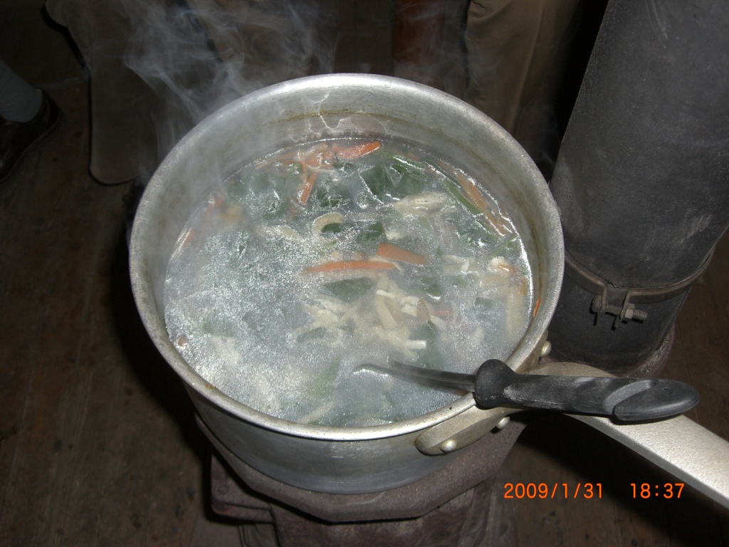 部屋(?)の中では、薪ストーブの上では牡蠣を使った鍋がかかっています。