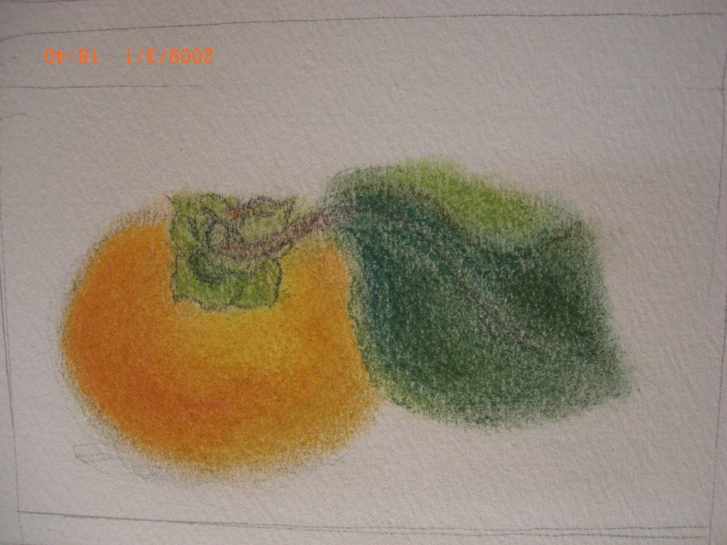 柿の絵を題材に、今度はパステルで書いてみることにしました。